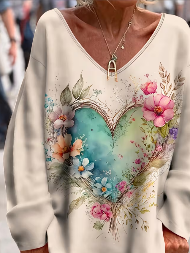 Women's Long Sleeve T-shirt Spring/Fall As Picture Heart/Cordate Printing V Neck Daily Going Out Casual Top
