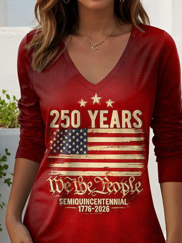 Women's USA 250th Anniversary Long Sleeve T-shirt Spring/Fall Red America Flag Printing V Neck Holiday Going Out Casual Top