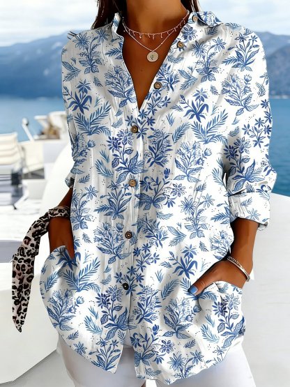 3D Printing Shawl Collar Blue Floral Spring Summer Going Out Casual Shirt