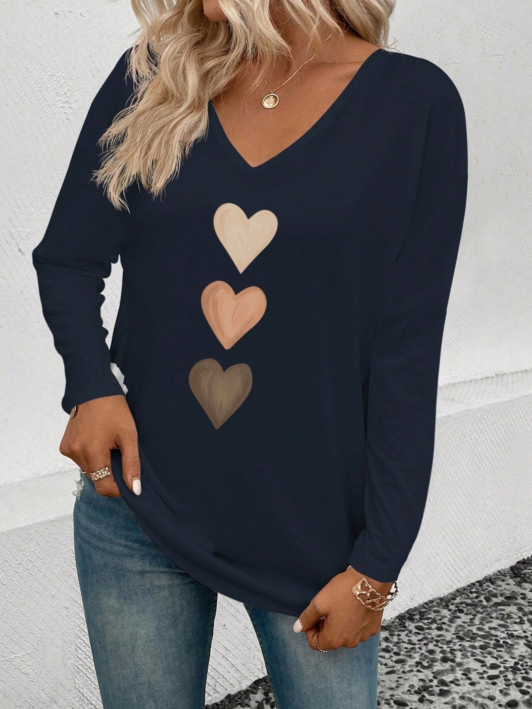 Heart Print Valentine's Day Long Sleeve V Neck Heart/Cordate Elegant Going Out Casual T-Shirt