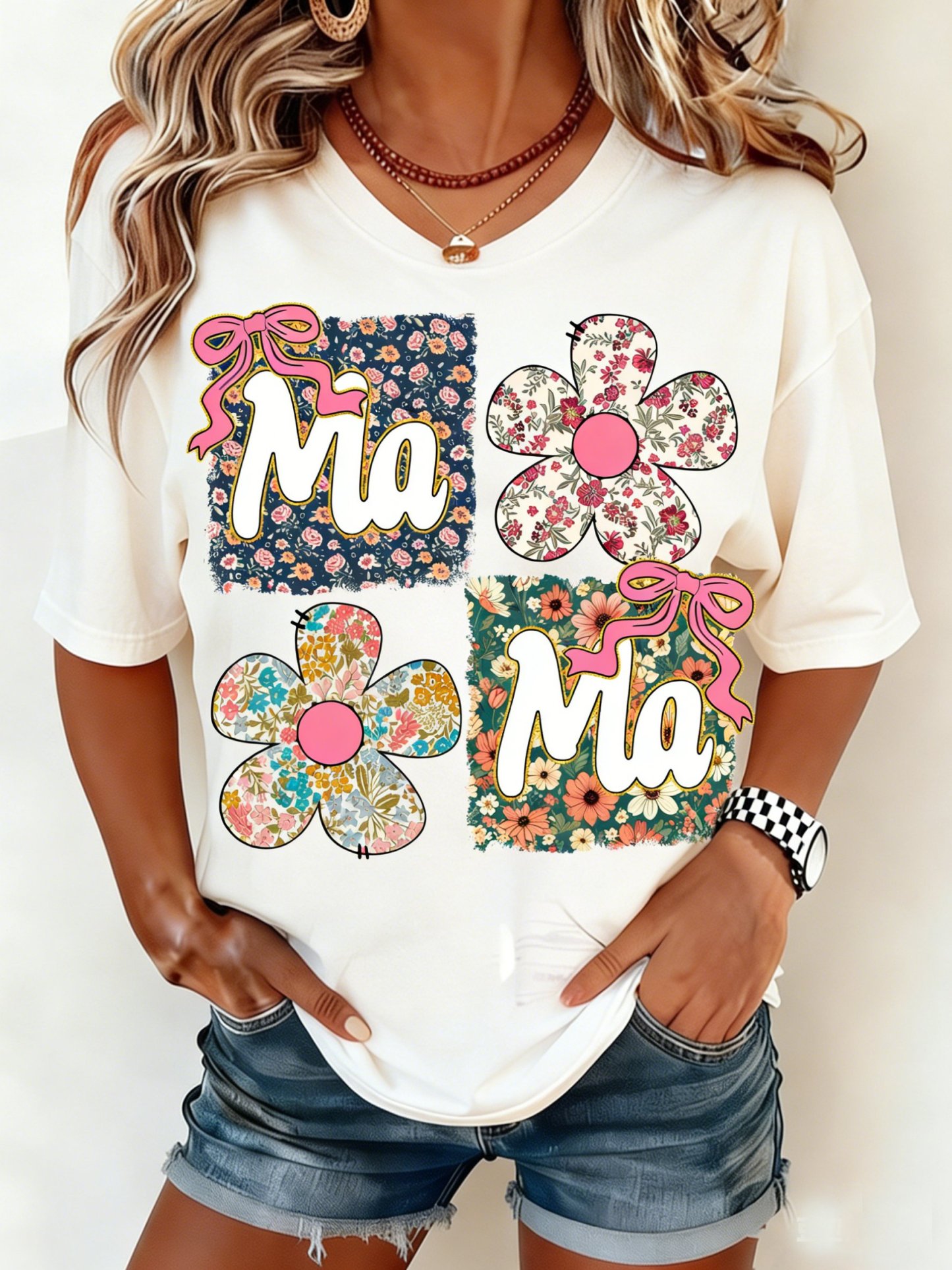 Mother's Day Letter Pattern Floral Short Sleeve Round Neck Loose Casual T-Shirt