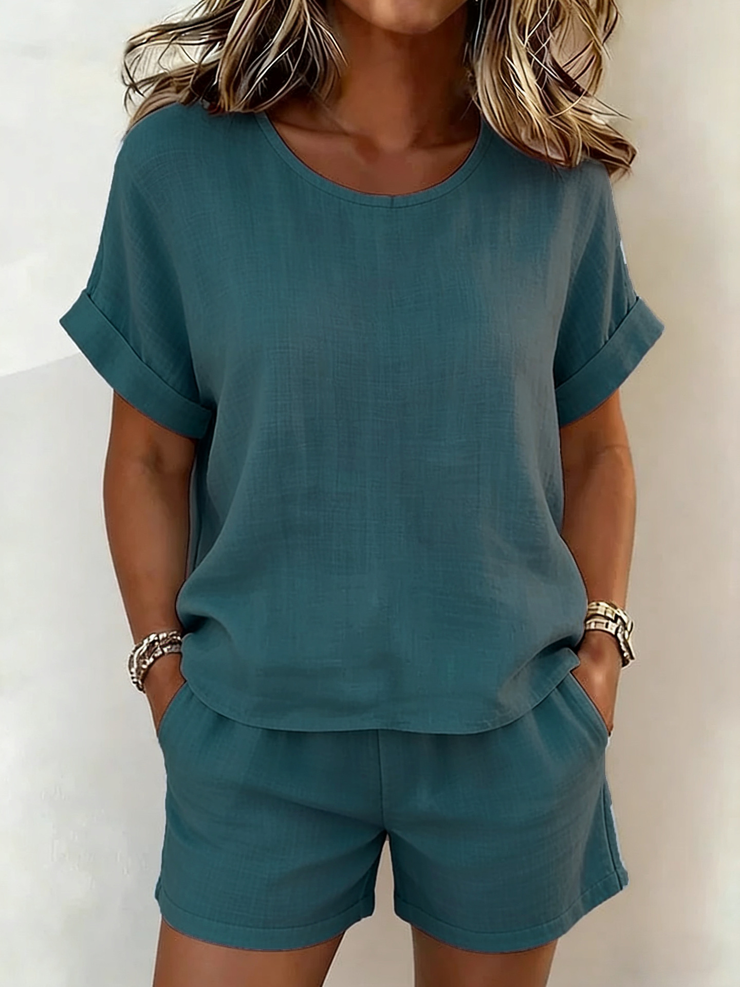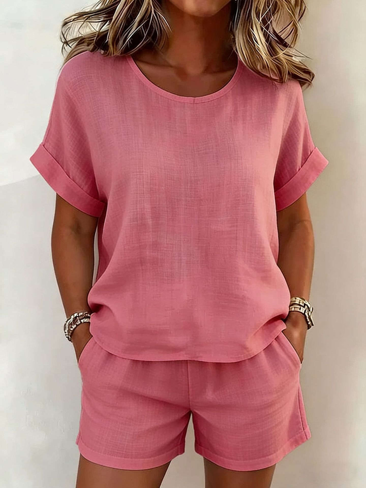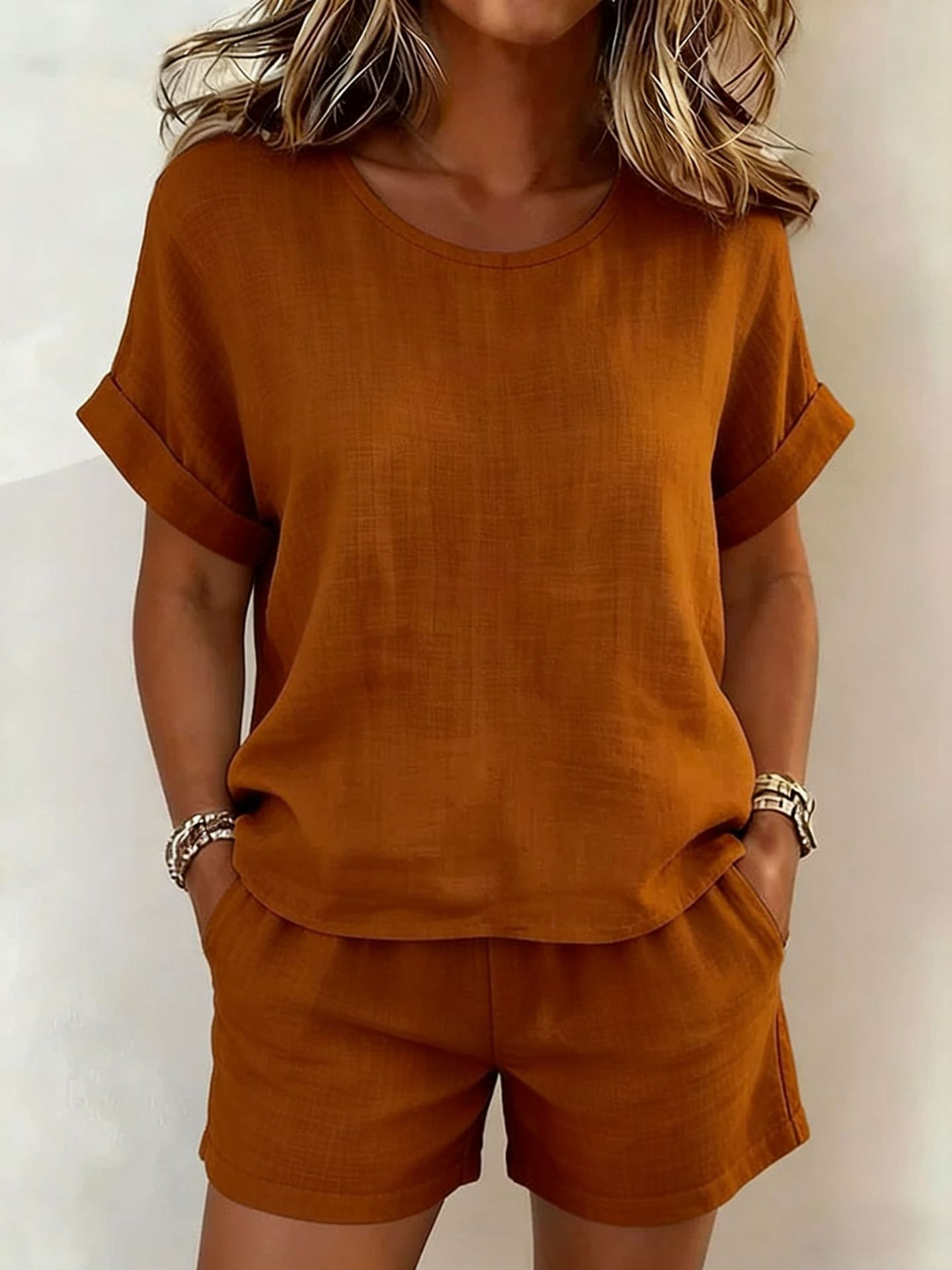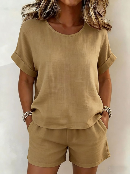 Plain Cotton And Linen Short Sleeve Round Neck Top With Shorts Summer Going Out Casual Short Set