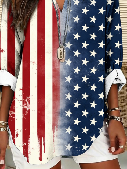 Women's Long Sleeve Blouse Spring/Fall As Picture America Flag Printing Cotton-Blend V Neck Daily Going Out Casual Top