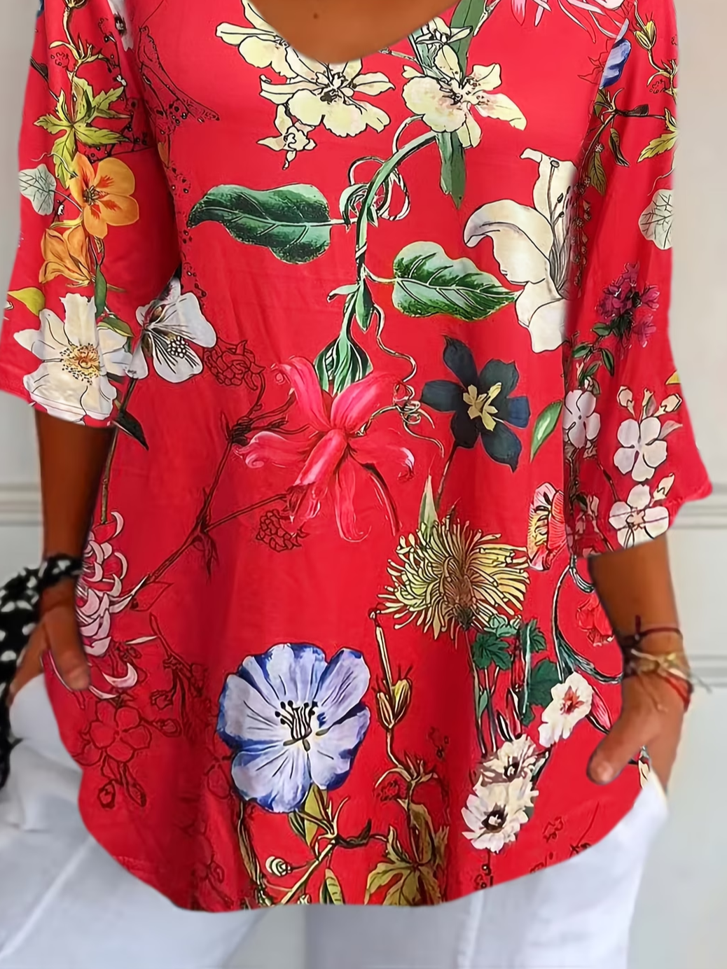 Women's Three Quarter Sleeve T-shirt Spring/Fall Red Floral Printing V Neck Daily Going Out Casual Top